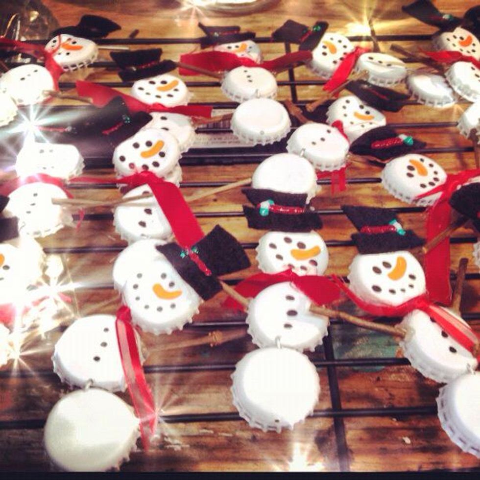 When glitter glue is dried completely, use a hot-glue gun to glue the top hat to our snowman's head. You want to make sure you don't cover the hole in the top bottle cap (for the ornament hook.)