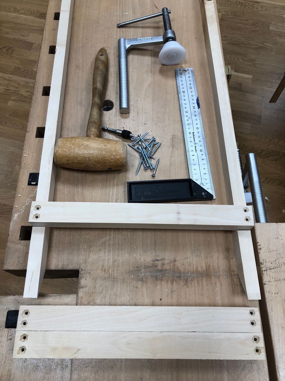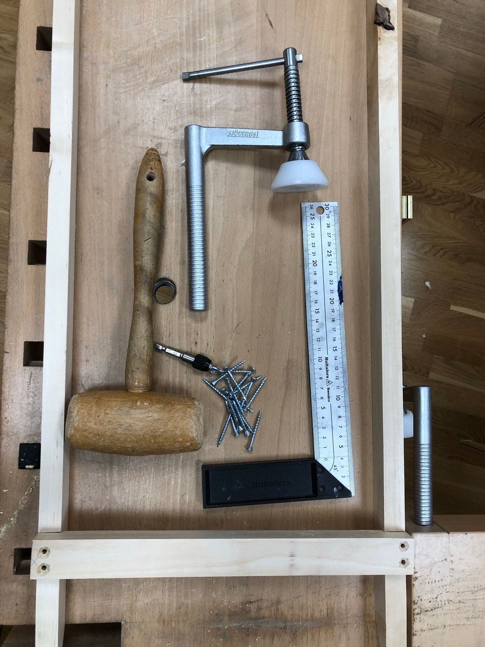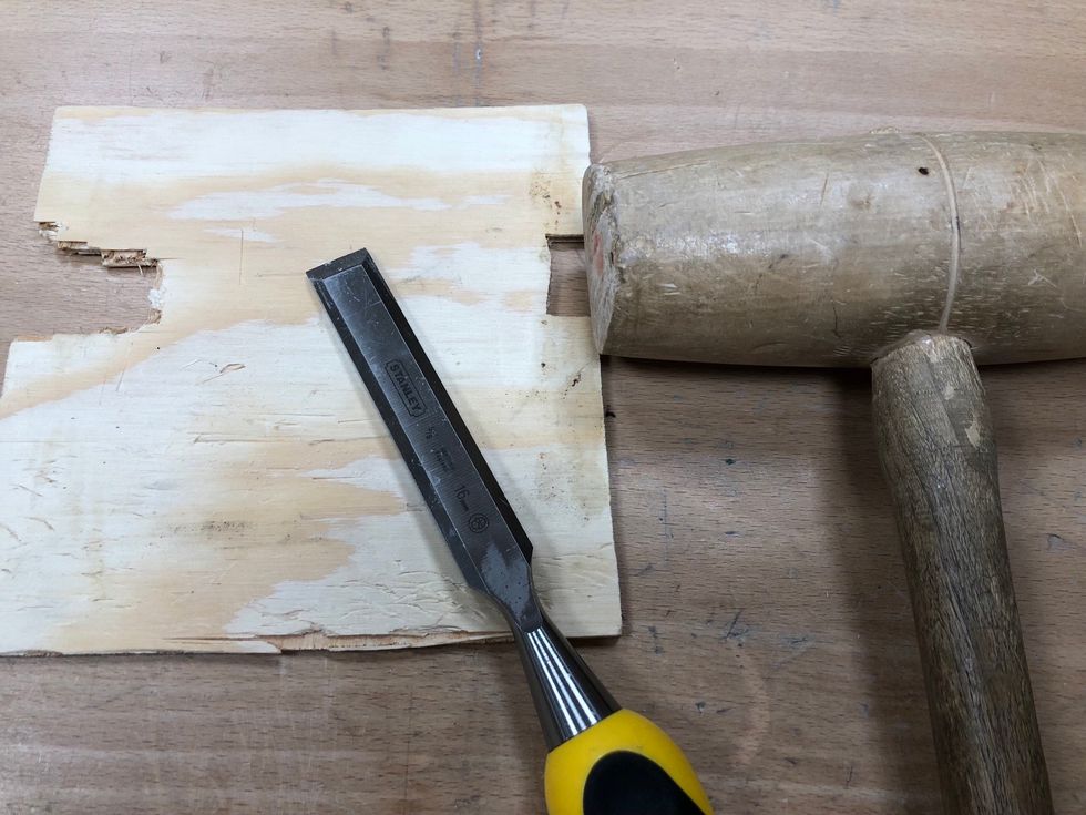 Ta bort alla andra verktyg från bänken. Nu behöver du ett stämjärn, en träklubba och ett bänkskydd.