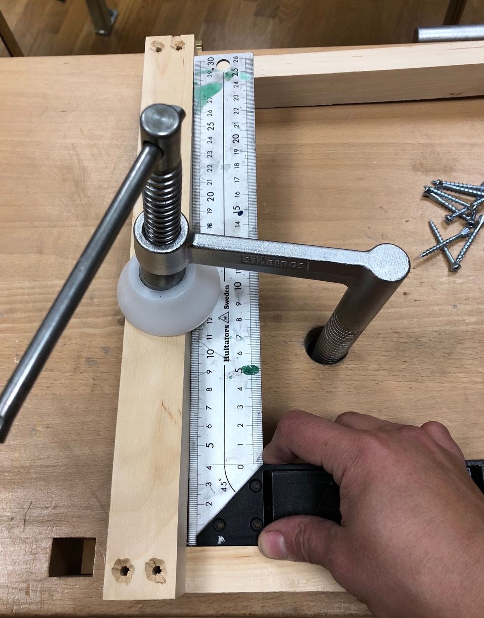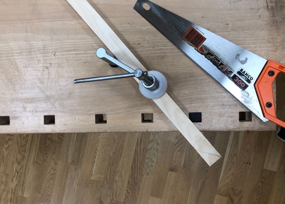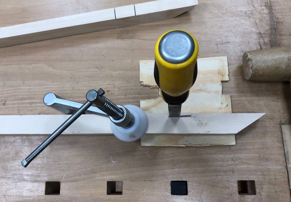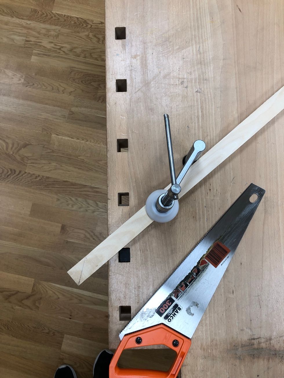 Spänn fast med bänkhaken. Hugg en bit innanför linjen