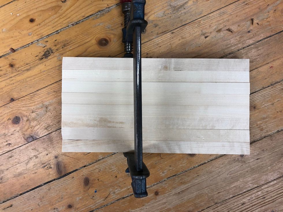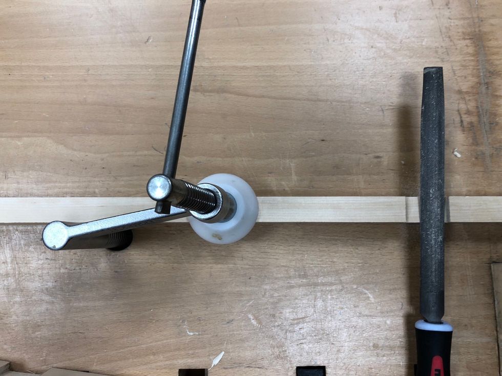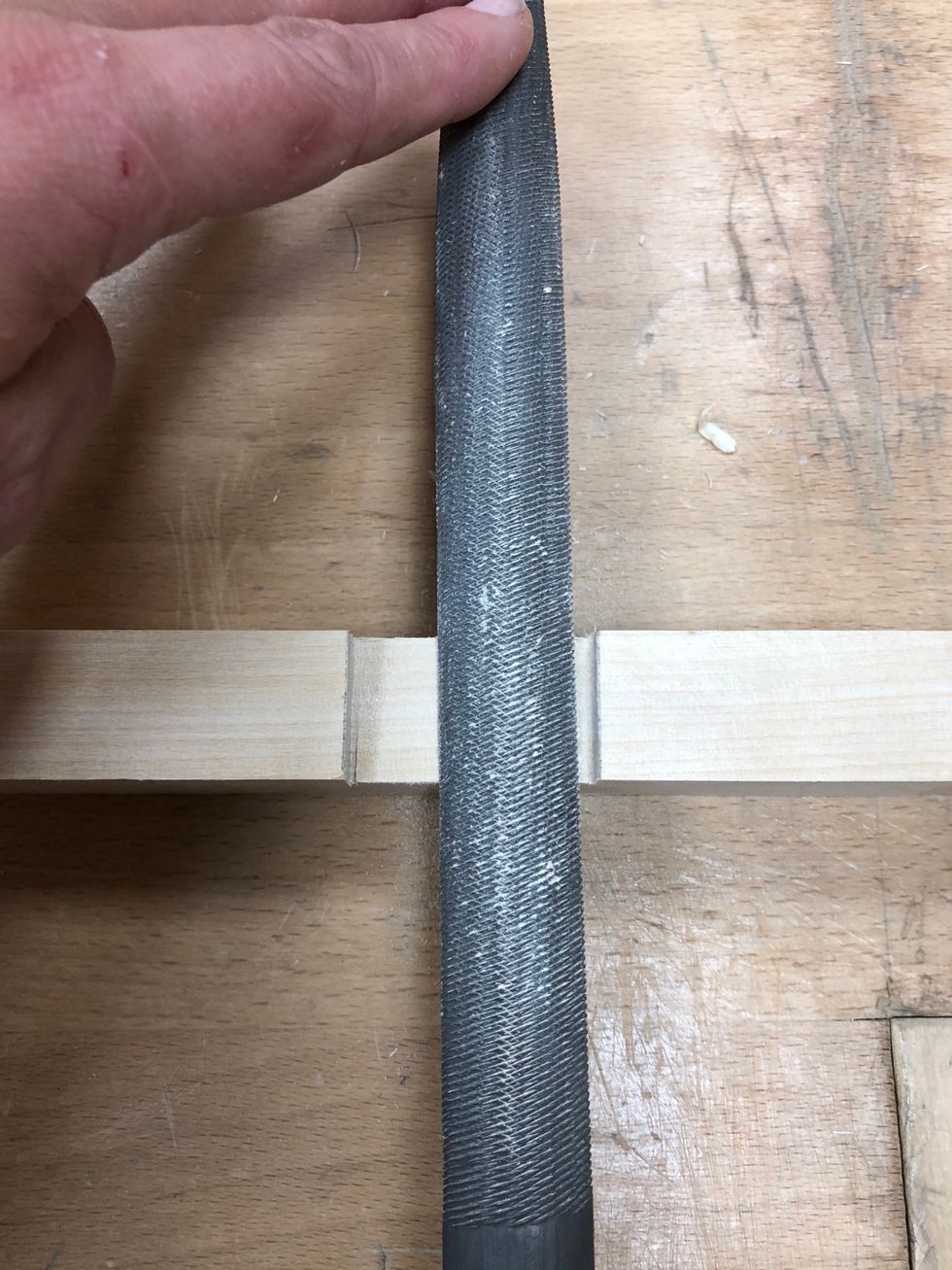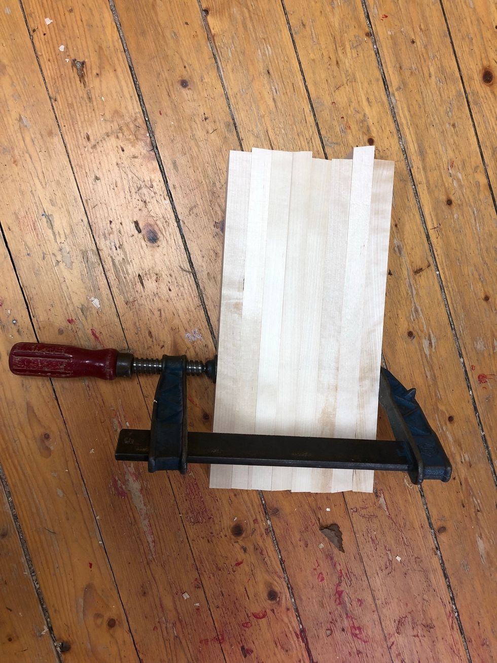 Spänn fast med bänkhaken. Hugg en bit innanför linjen