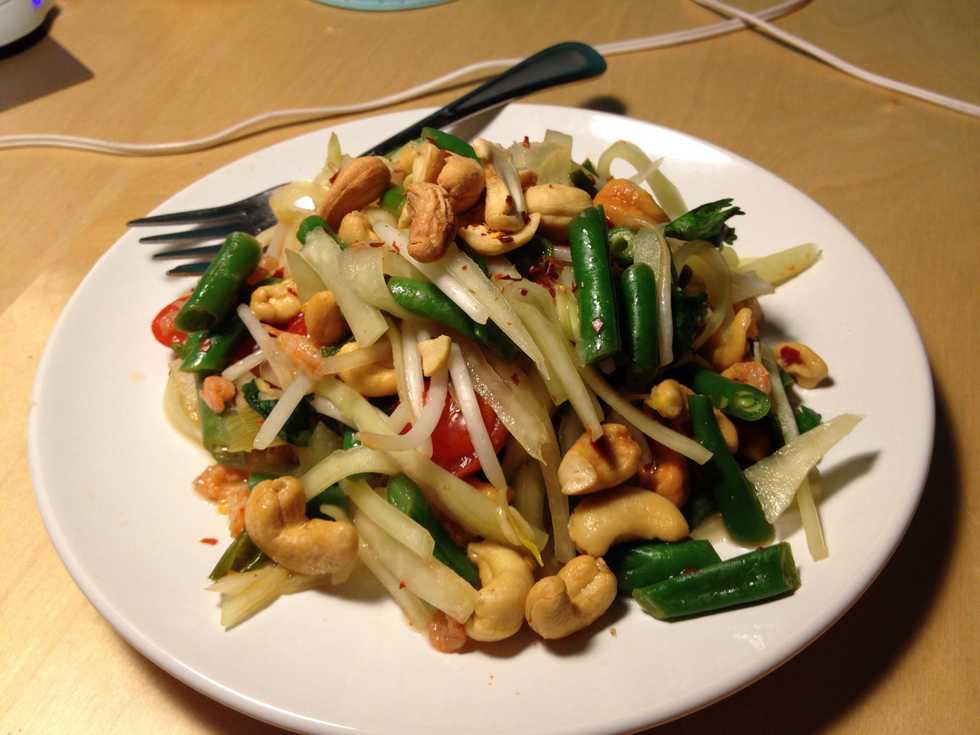 Taste for seasoning. Mound in a bowl (if desired, line bowl with lettuce leaves beforehand). Sprinkle with peanuts and serve.