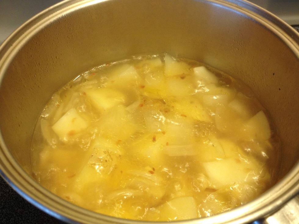 Once the potatoes are cooked, remove lid and continue to cook until much of the water is reduced.