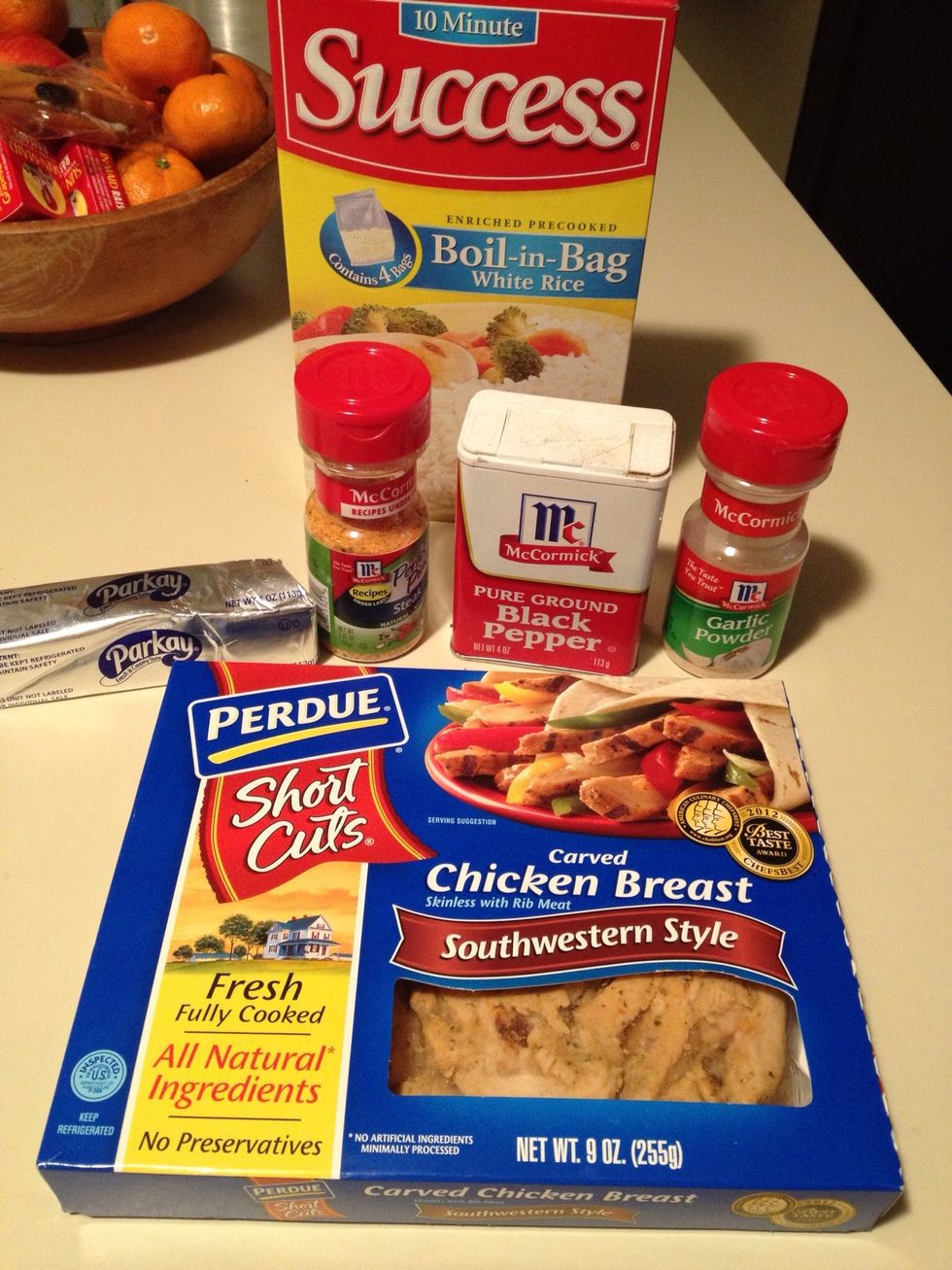 Boil water and add salt. Cook rice for ten minutes. After completed mix rice and chicken breast. Enjoy!