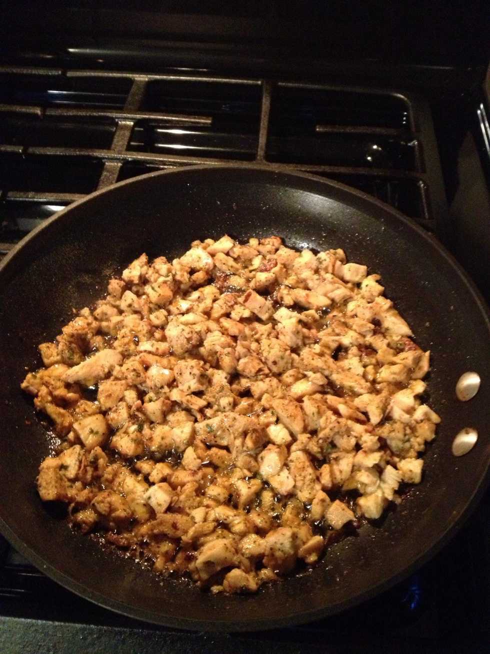 Open package of chicken breast and cut up in to small pieces. Melt half a stick of butter in pan then add chicken breast and season with pepper, garlic powder and broiled steak seasoning.