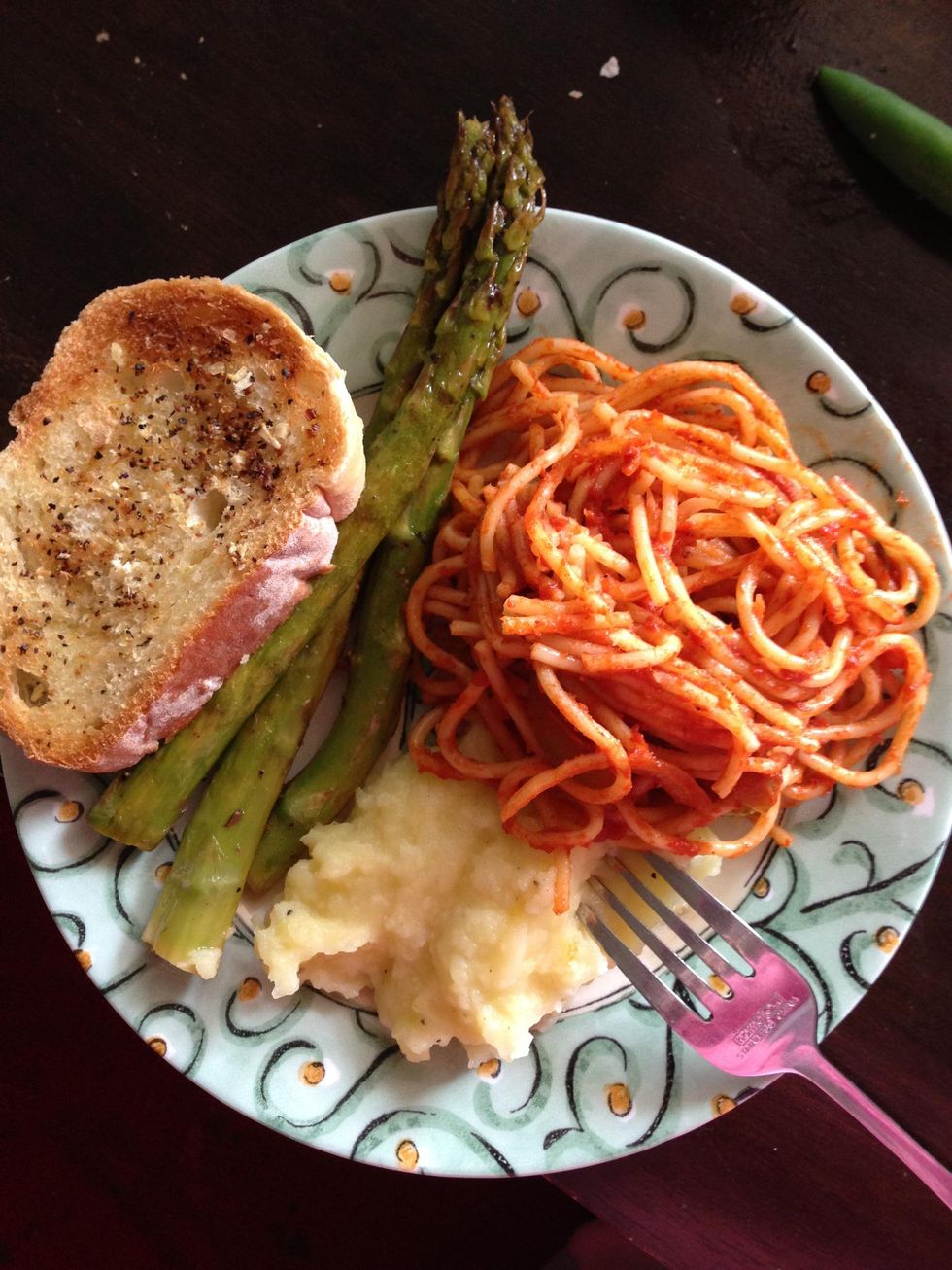 Serve it up! Usually we eat spaghetti with salad but my husband wanted asparagus today. I also had left over bread so I use that today.