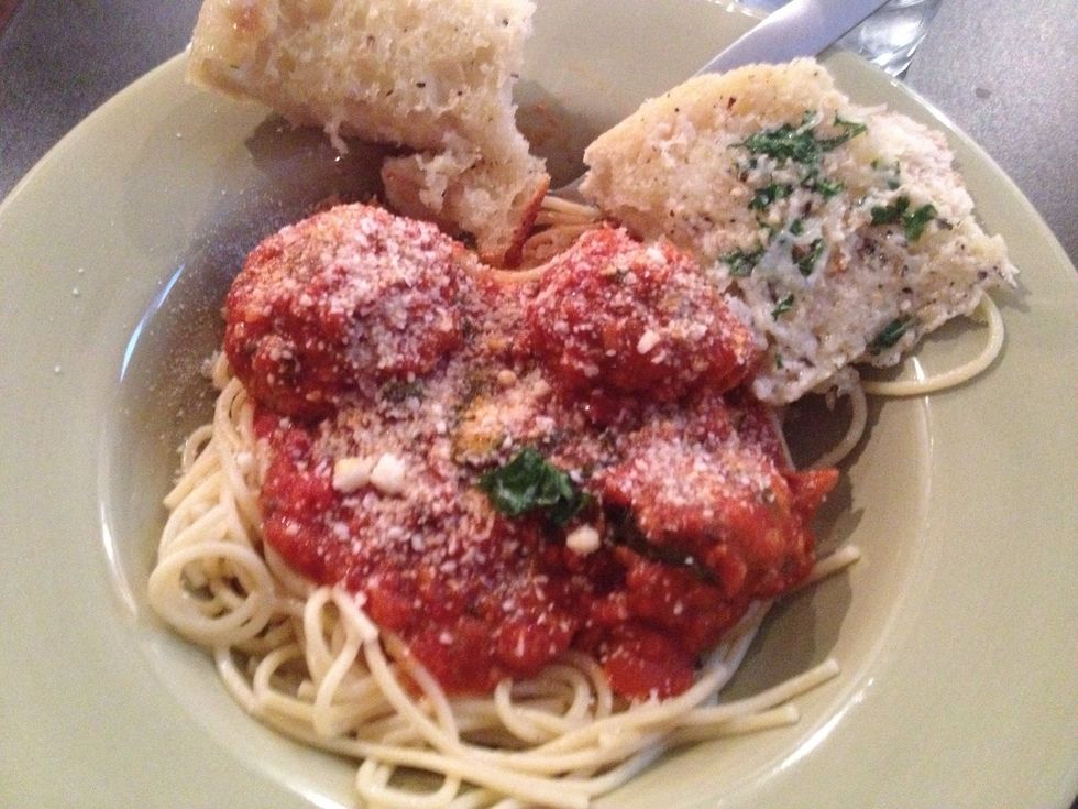 After baking, I threw meatballs in store bought pasta sauce and let everything simmer together a while.
