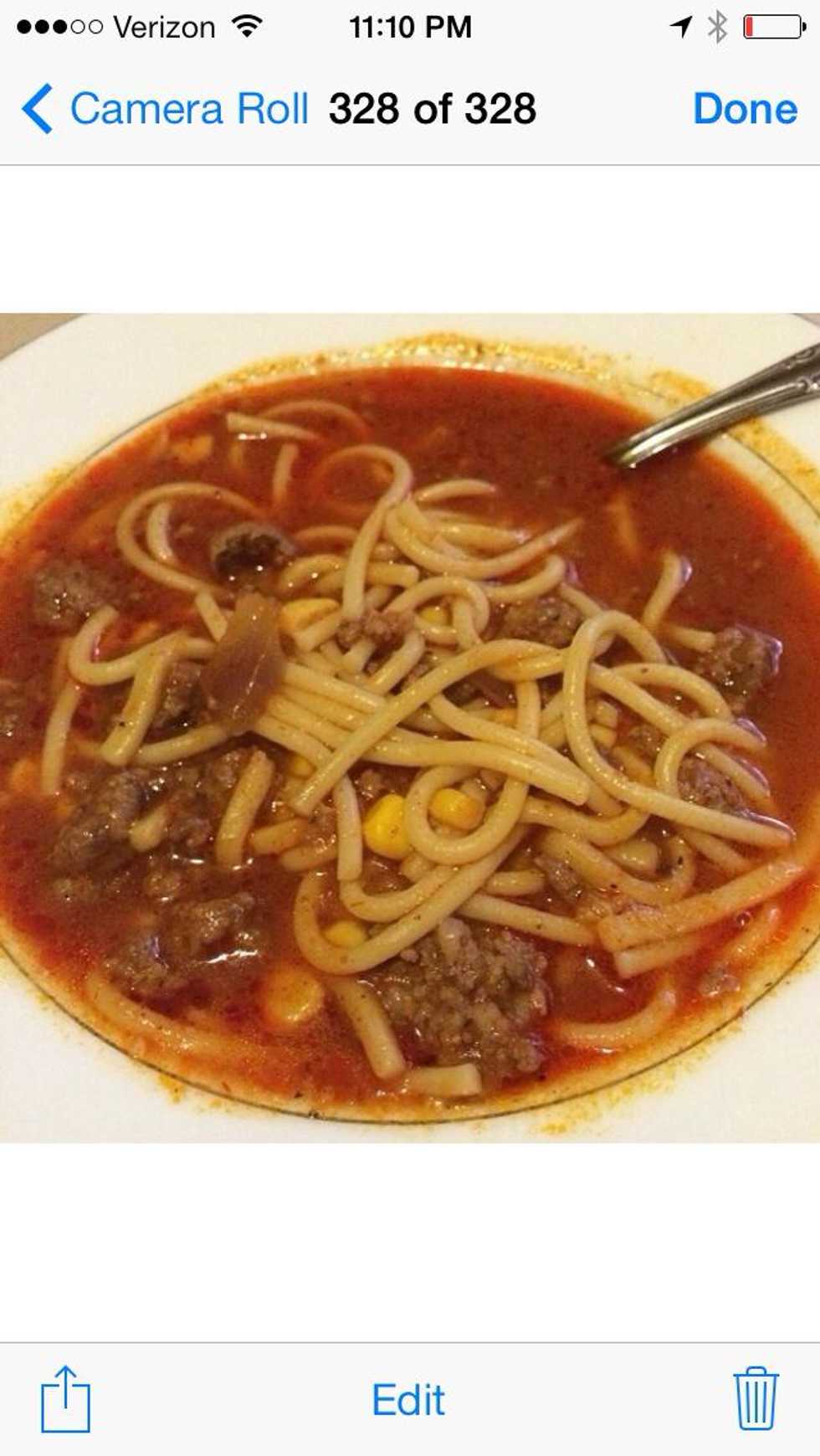 Add meat to the main pot with the cooked potatoes, and spaghetti👉