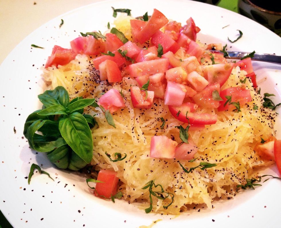 Drizzle with olive oil. Top with tomatoes. Salt and pepper to taste...and garnish with chopped basil.