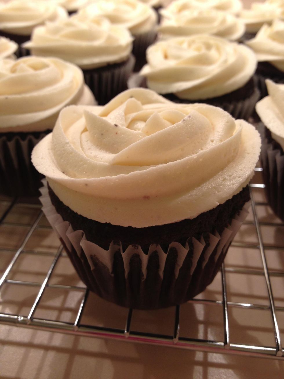 Start at the centre of the cupcake and ice in a circular motion towards the outside of the cupcake to achieve a rose effect