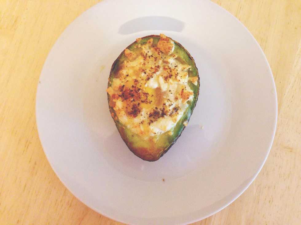 Ingredients: ripe avocado, egg, cajun Spice, Herbamare, feta cheese