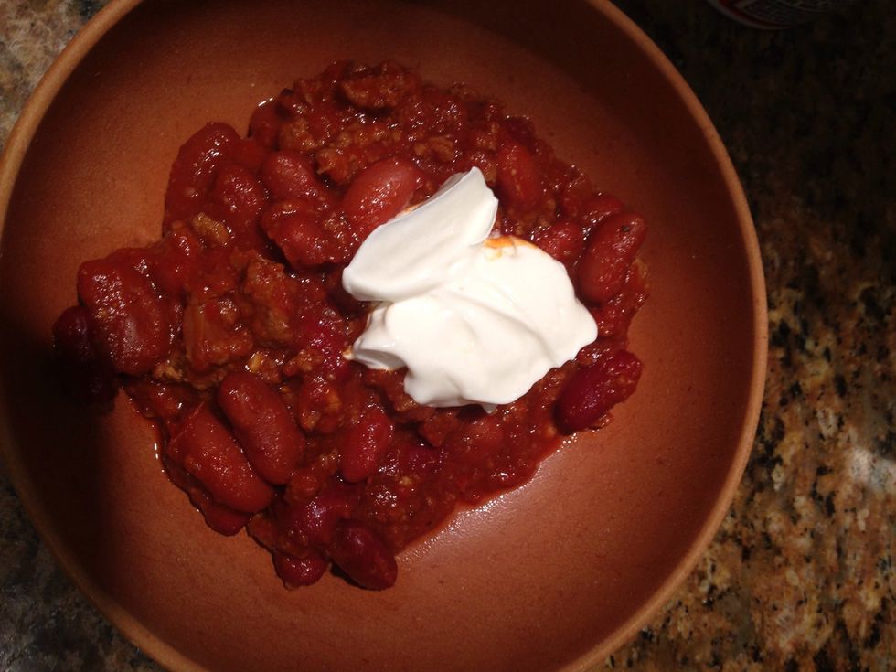 Serve with a dollop of sour cream. We also cooked up a batch of rice to put the chili over. You can also chop up some green onions and some shredded cheddar cheese. Bon Apetit!!