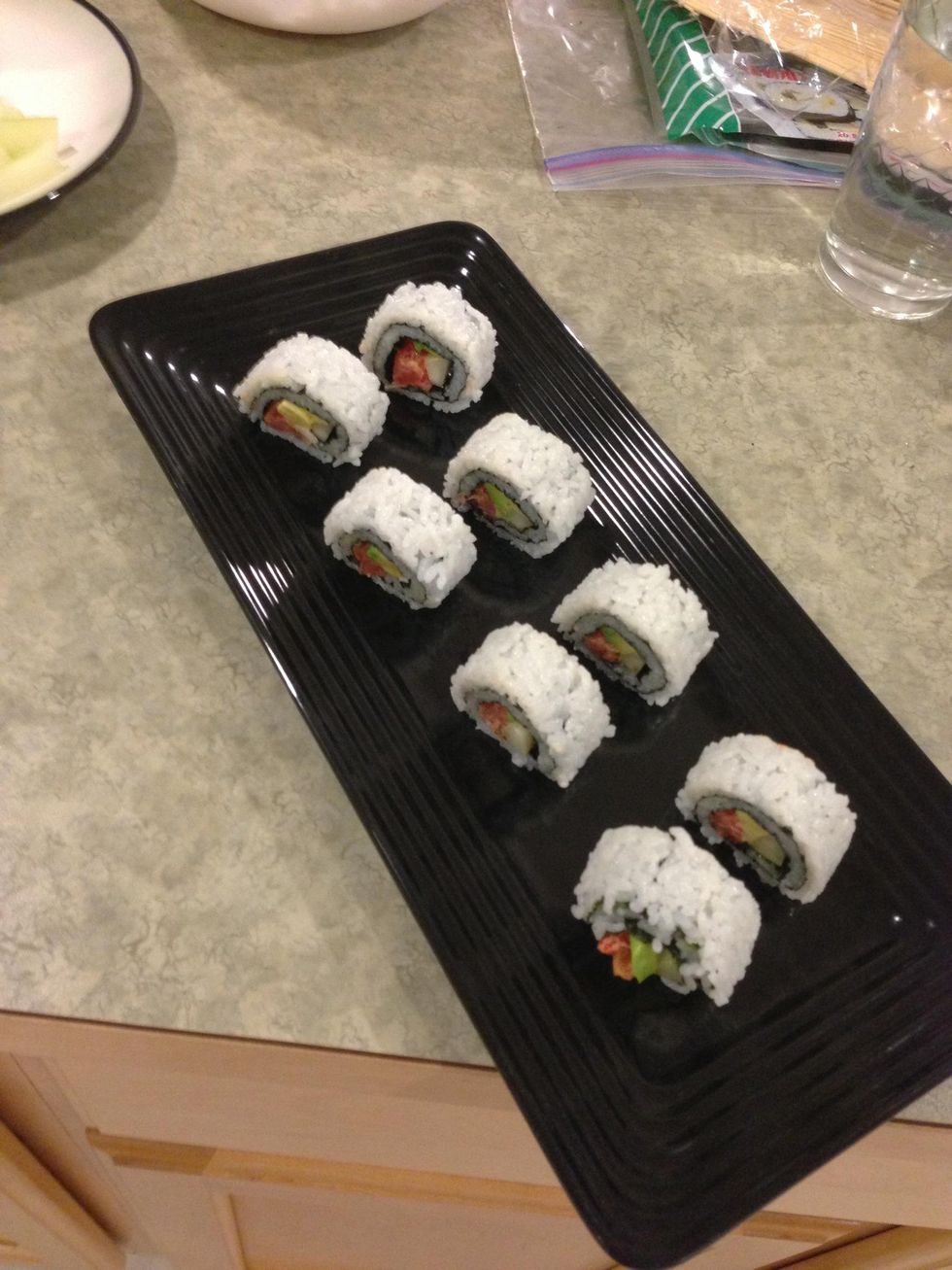 Make 3 cups sticky white rice and put in bowl with rice vinegar. add vinegar sparingly to your liking and let rice cool down