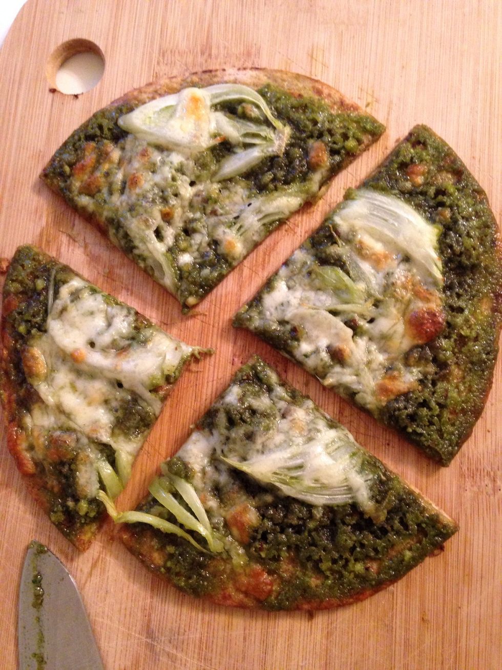 Spread the mixture on a whole wheat flatbread or wrap. Add onions and mozzarella. Bake at 300 degrees F for 10 minutes, or until lightly browned and crispy.