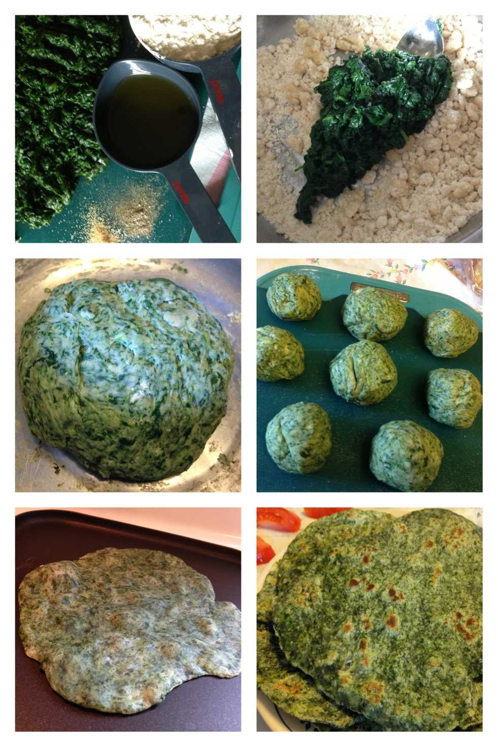 3. Add the (hot or warm) spinach mixture, including the water left in the pan from cooking. Knead or stir, adding additional flour as needed to make a smooth dough. Knead dough for about 5 minutes.