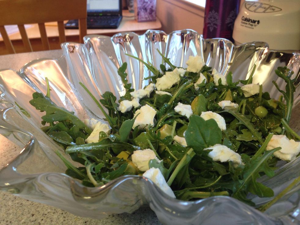 Toss with arugula. Sprinkle over with goat cheese and season to taste with sea salt and black pepper before serving.