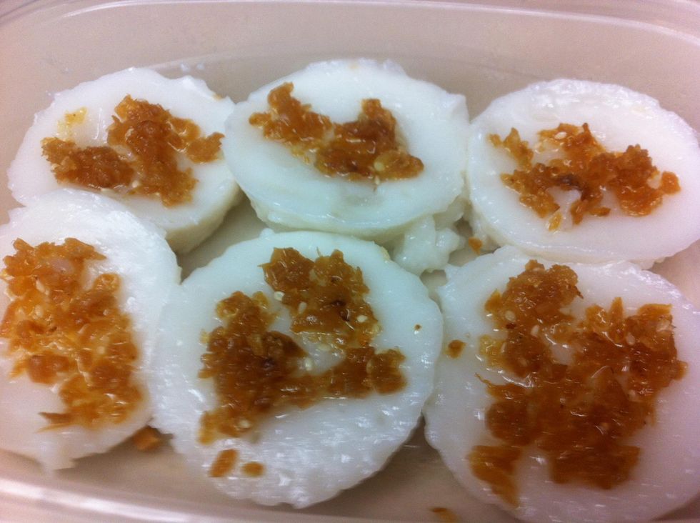 Grease the moulds (can use muffin mould). Pour the mixture into each mould and place it on steamer. Steam over rapidly boiling water for about 20 minutes.