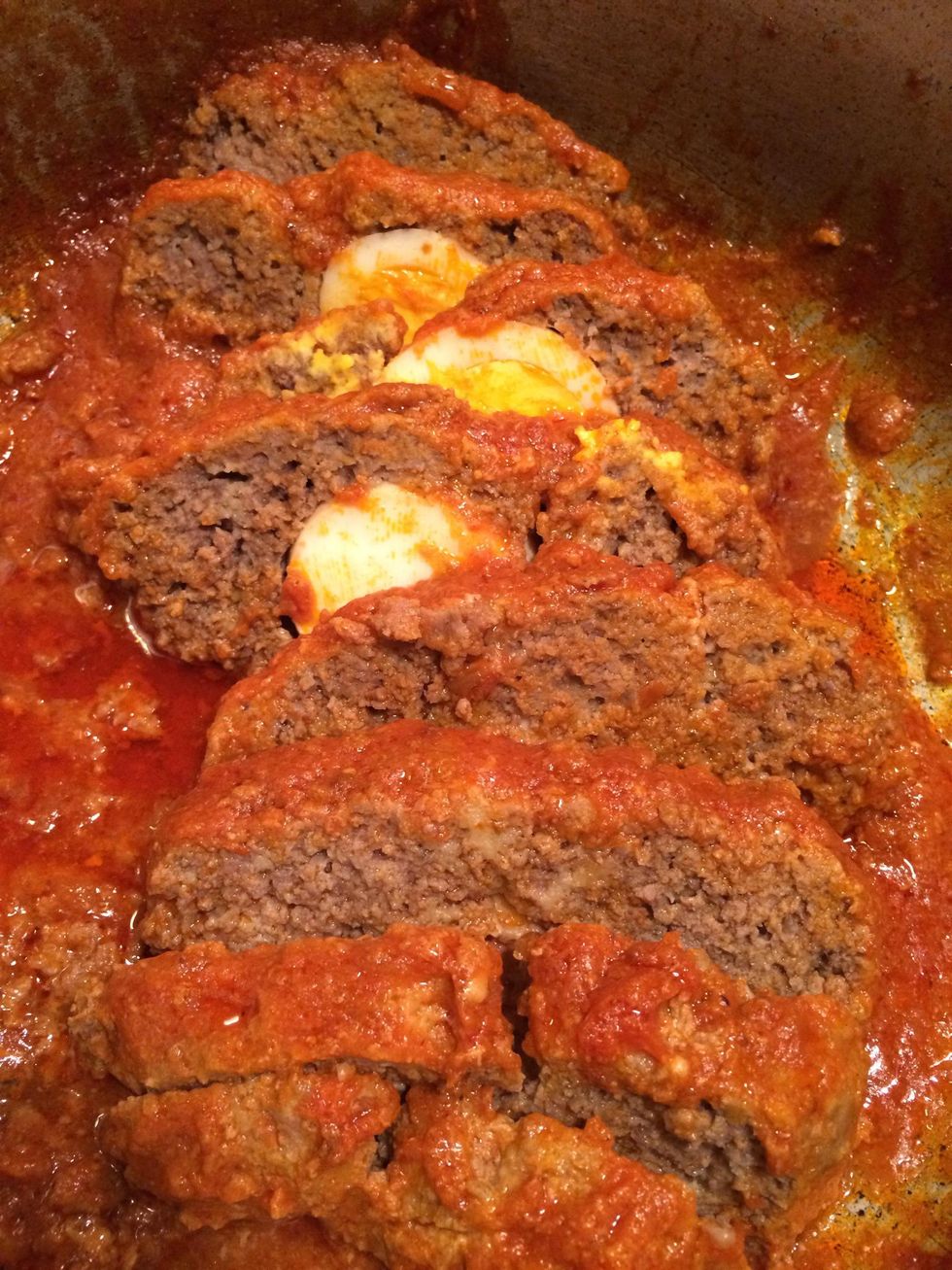 You will now need a pot in which you will add the meatloaf mixture. We will free-form the meatloaf. While free forming into a rectangle we will make an indentation lge enough to fit 2 hard boiled eggs