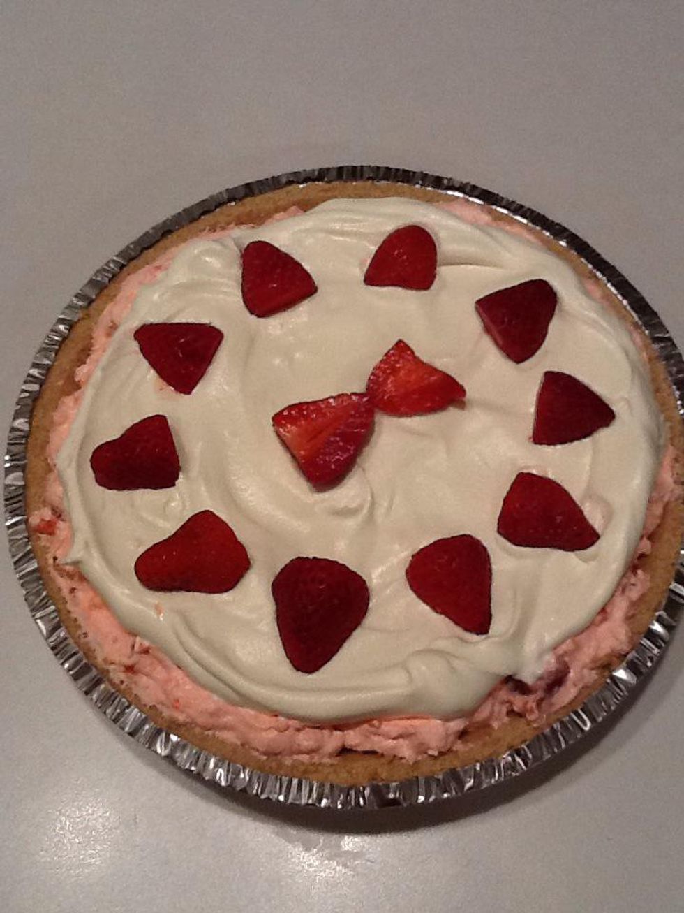 When partially set remove from fridge and add strawberries and one and a half tubs of Cool Whip. (Yes, this is what makes it a Strawberry DREAM pie!)