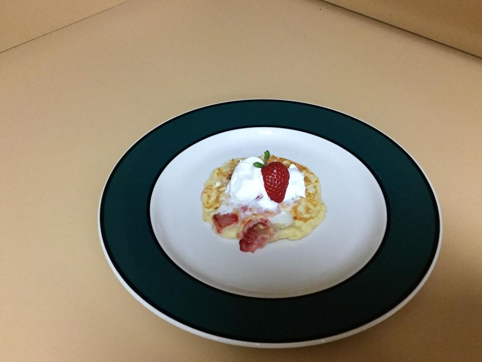 Remove pancakes to a plate. Top with cool whip and strawberries for the finished product. Enjoy!