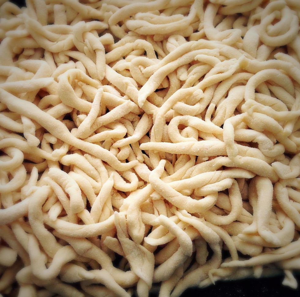 Coat with plenty of flour, roll on itself and slice like making 1.5cm wide tagliatelle.