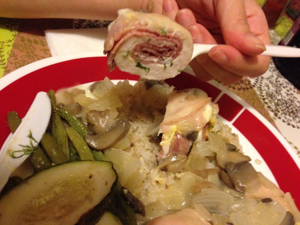Plate.. I made a brown rice mound flattened a hole placed one roll on it and two beside poured the mushroom sauce on the chicken And baked zucchini and string beans with a little oil