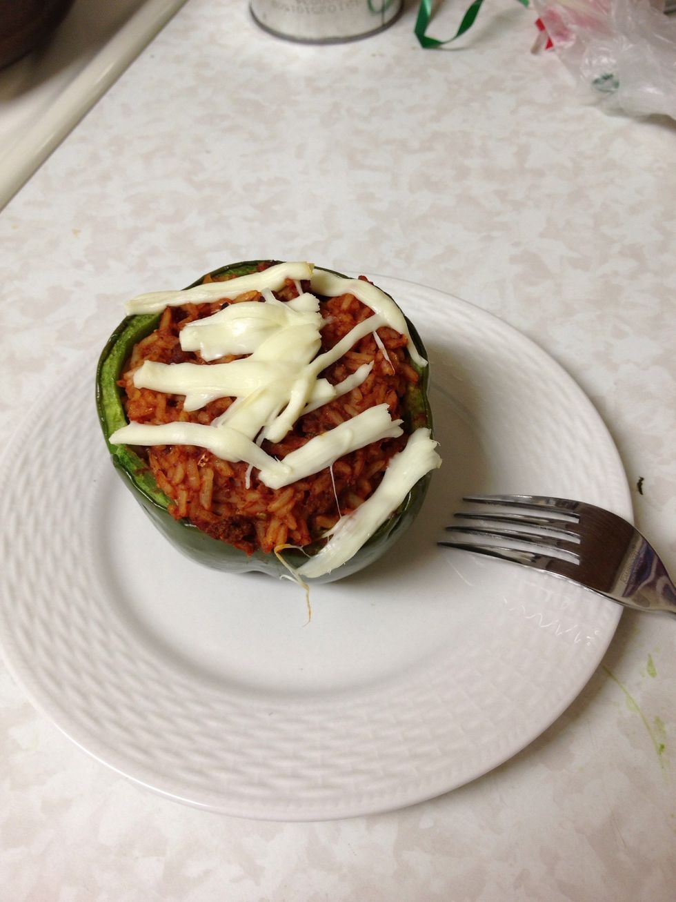 After 25 minutes top with shredded mozzarella cheese (I was out so I used string cheese) and bake for 5 more minutes, or until cheese is melted.