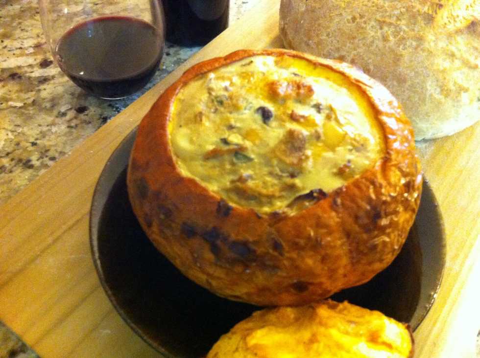 This is what a stuffed pumpkin baked in a cob oven should look like when done. Let it rest at least 20 minutes before cutting or serving.