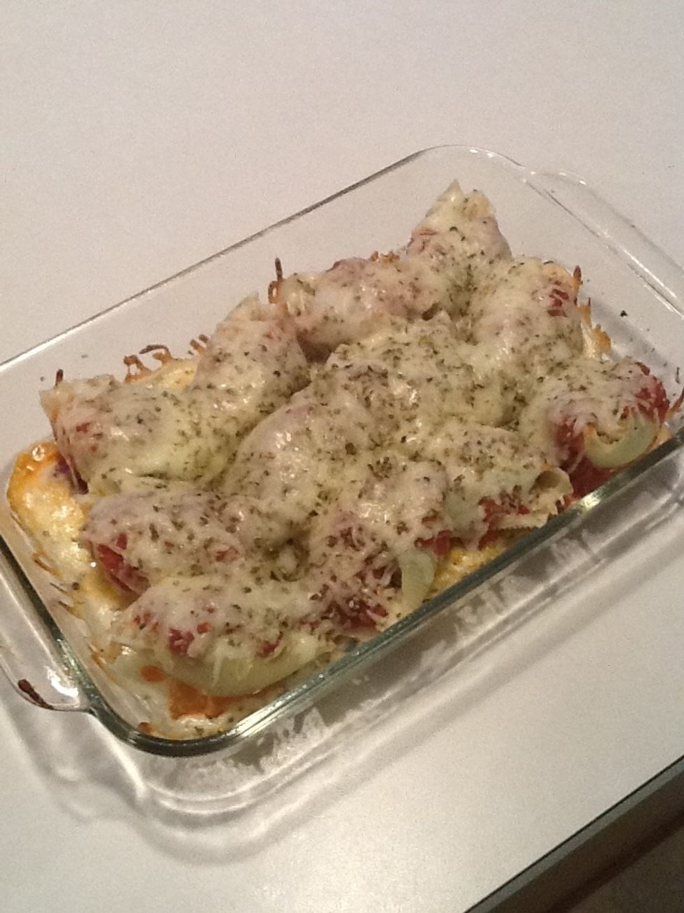 Pour sauce over pasta shells.
