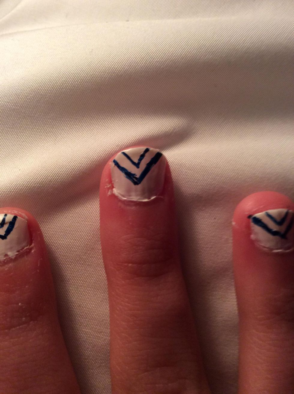 First paint your nail white and let dryThen once dry, paint with your pen 2 trianglesLike so...And ta da!!Thanks so much for looking at my guide, please comment!