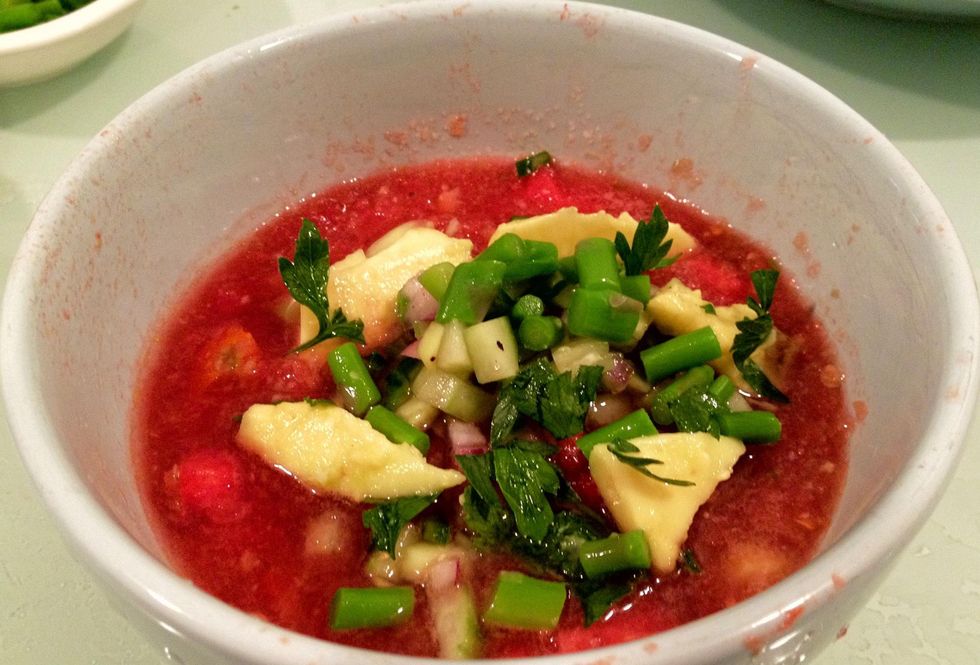 Add whatever toppings you like before serving: croutons, crabmeat, cooked shrimp, etc. Refreshing! 😊