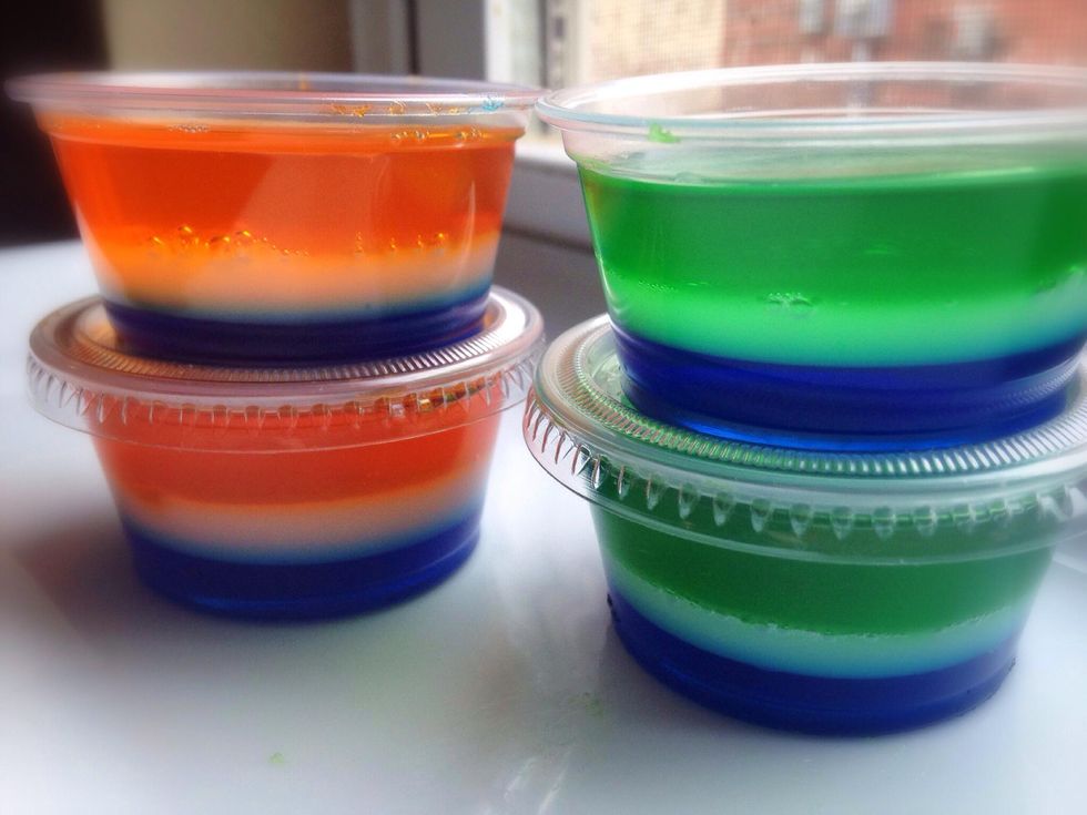 Heat 1/2c water and 1/2c vodka in microwave safe bowl for 2.5-3 mins. Whisk 2 packets gelatin until dissolved.