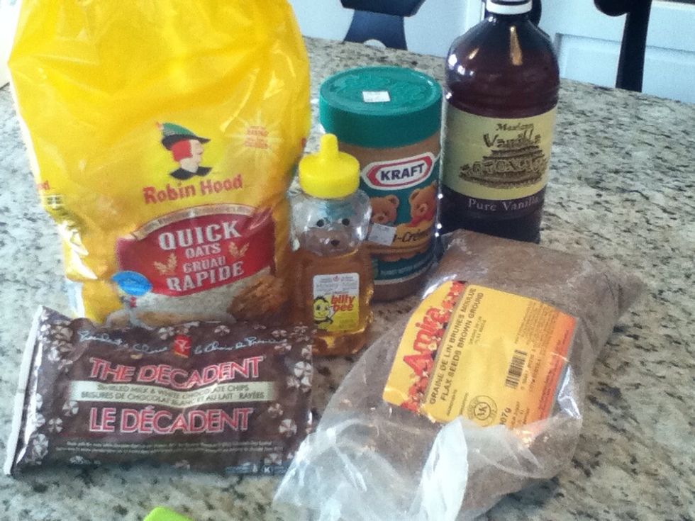 INGREDIENTS: 1 cup of oatmeal 1/2 cup of chocolate chips 1/2 cup of peanut butter 1/2 cup of flax seed 1/3 cup of honey 1 teaspoon of vanilla.