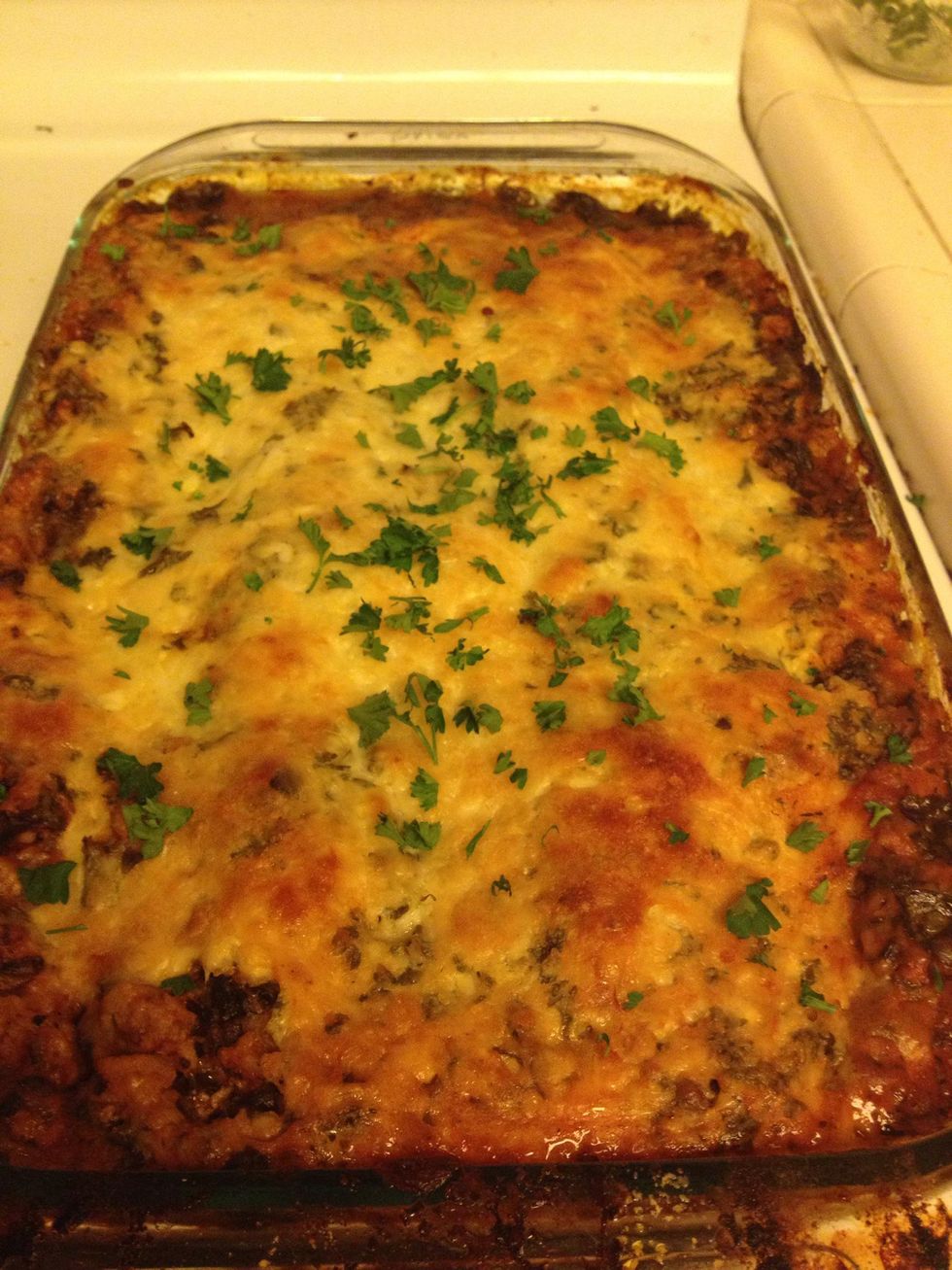 Add more noodles. Continue layering meat sauce, cheese mix, and noodles (in that order). Leave enough meat sauce and cheese mix for the last layer. I forgot to take a photo because I was too excited!