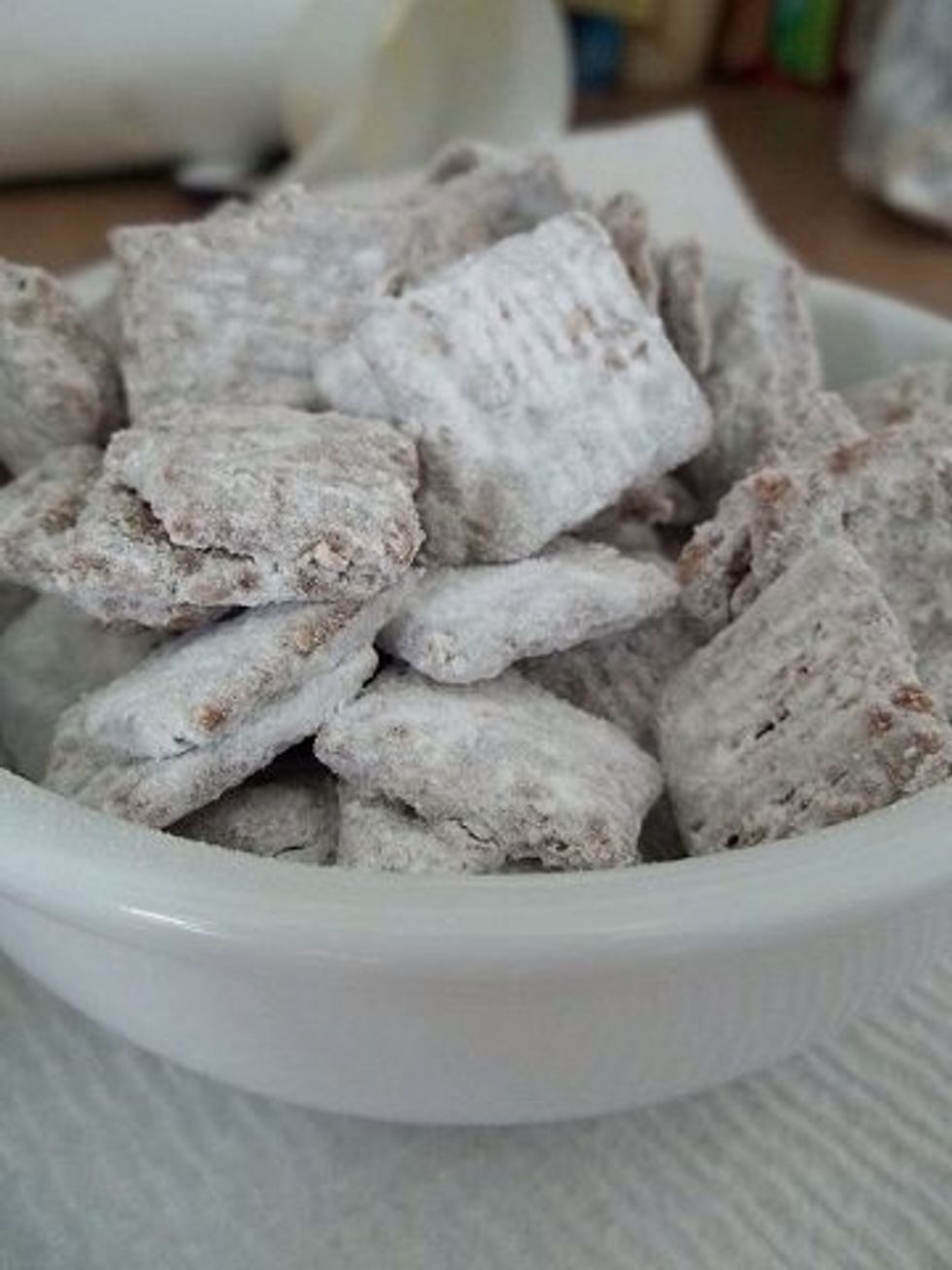 Place chex mix into bag close tight and begin to mix all the powdered sugar onto the chex mix. Now this is optional but place in freezer for about 15 minutes to cool and then serve :)!!!