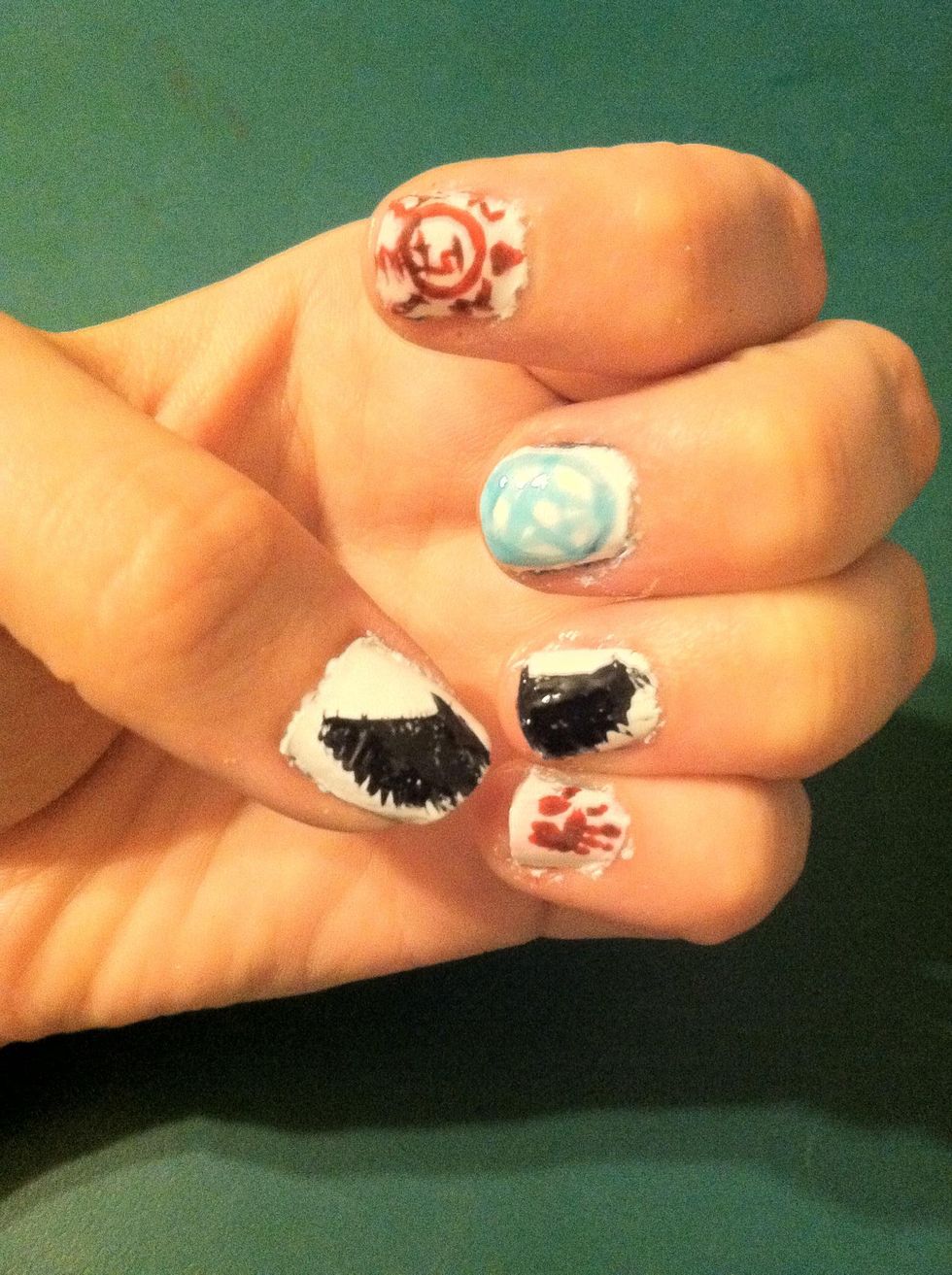 To create the angel banishing sigil on your index finger using the same red, make a circle at the center of your nail.