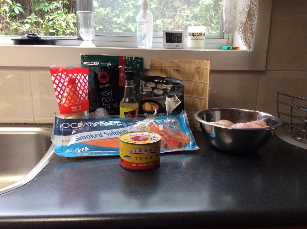 Lay out the bamboo may, placing the seaweed on top. Then squeeze some mayonnaise on your hands to stop the rice sticking
