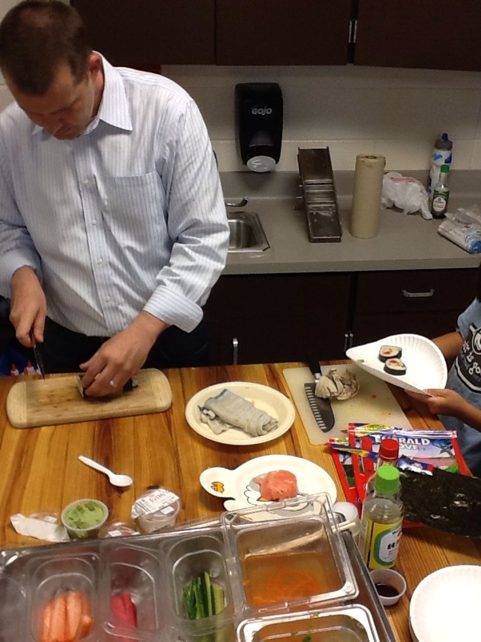 Next before you even start you need to have all your supplies out Then you take a piece of nori and you pile rice on top and spread the rice on the nori but make sure you don't smear or els it'll rip