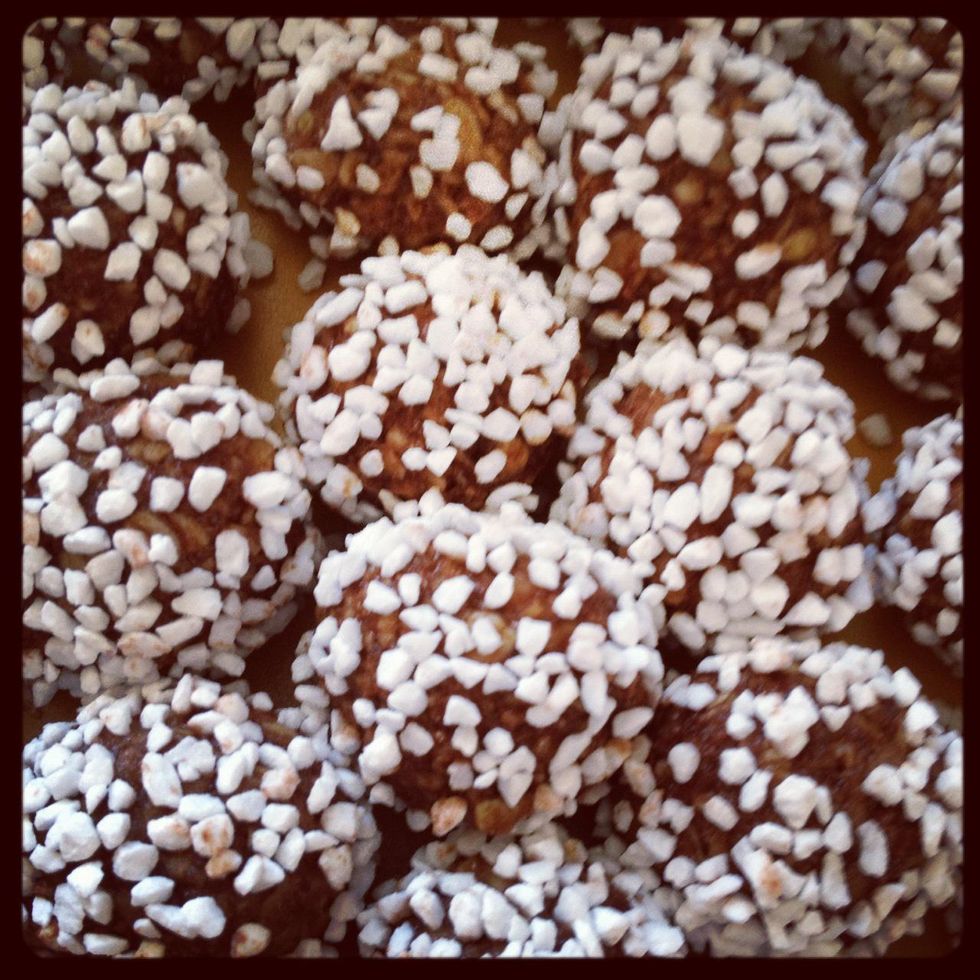 Now get two plates and some pearl (?) sugar, coconut flakes, crushed nuts or whatever you want to decorate your yummy oatmeal balls with.