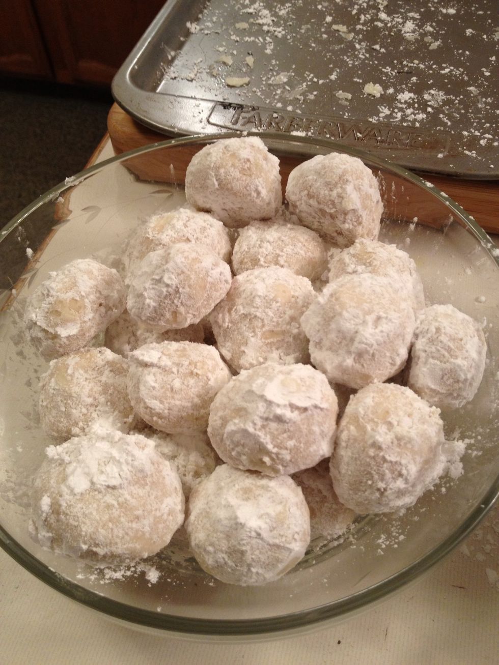 Let cookies cool for about minute or two and then coat in first layer of powdered sugar.