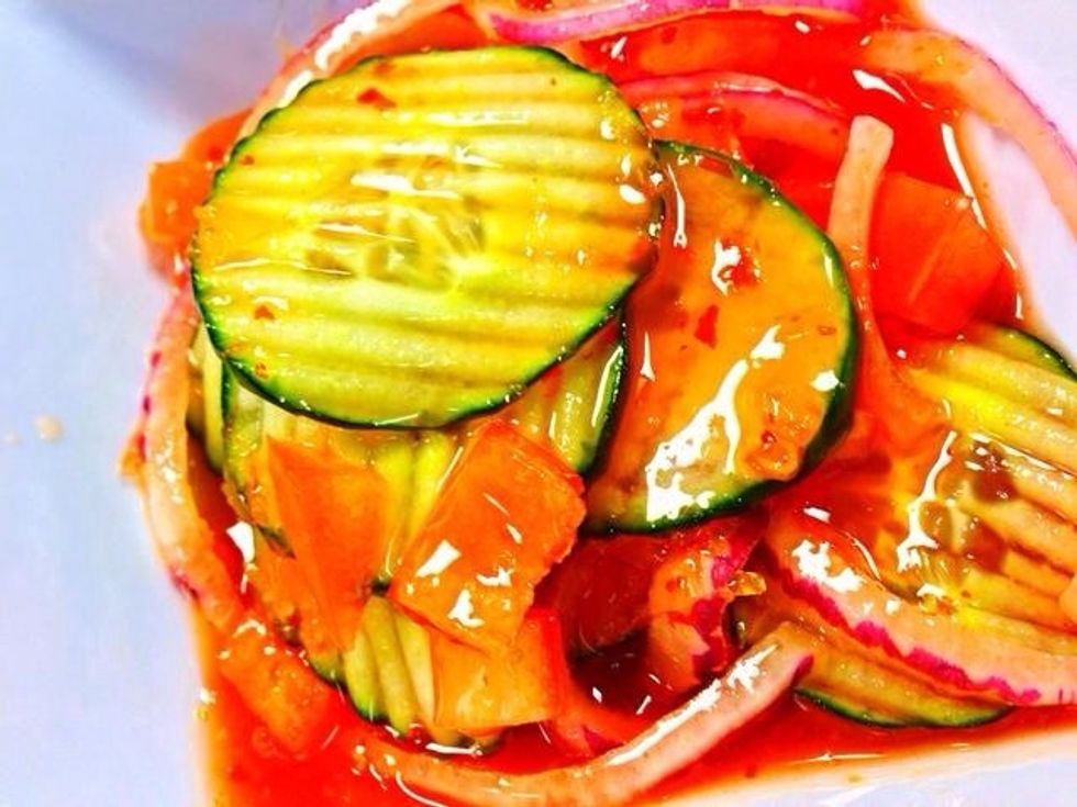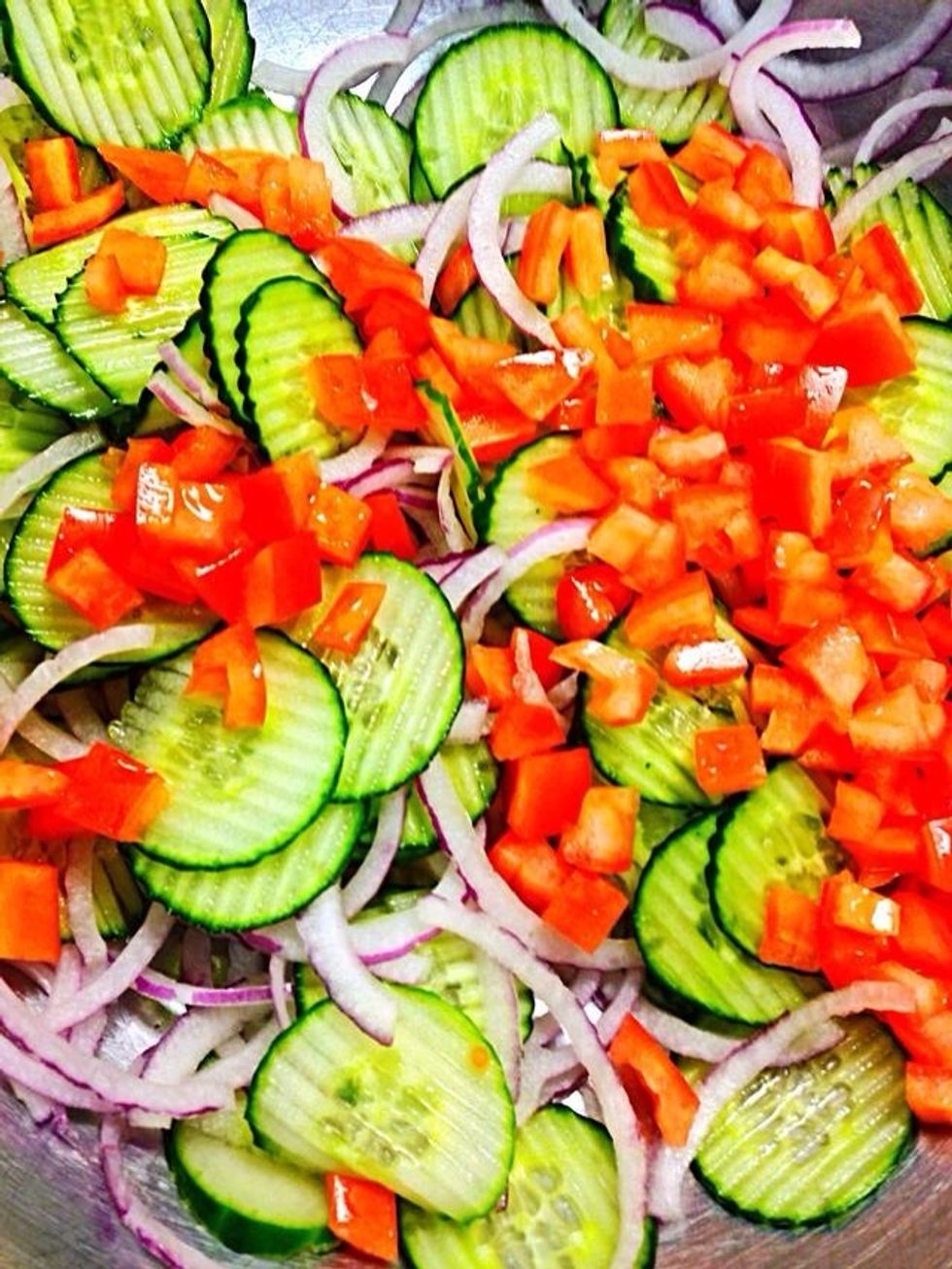 You will need: 1 Cucumber 1 Red Onion 2 Tomatoes Bottle of Sweet Chili Sauce