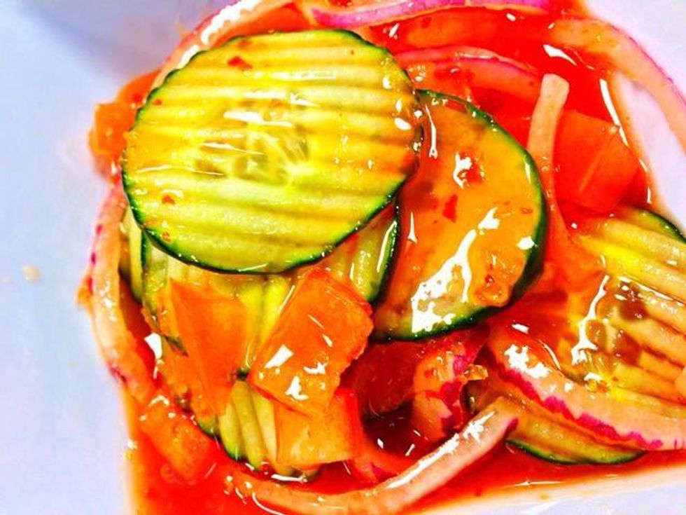You will need: 1 Cucumber 1 Red Onion 2 Tomatoes Bottle of Sweet Chili Sauce