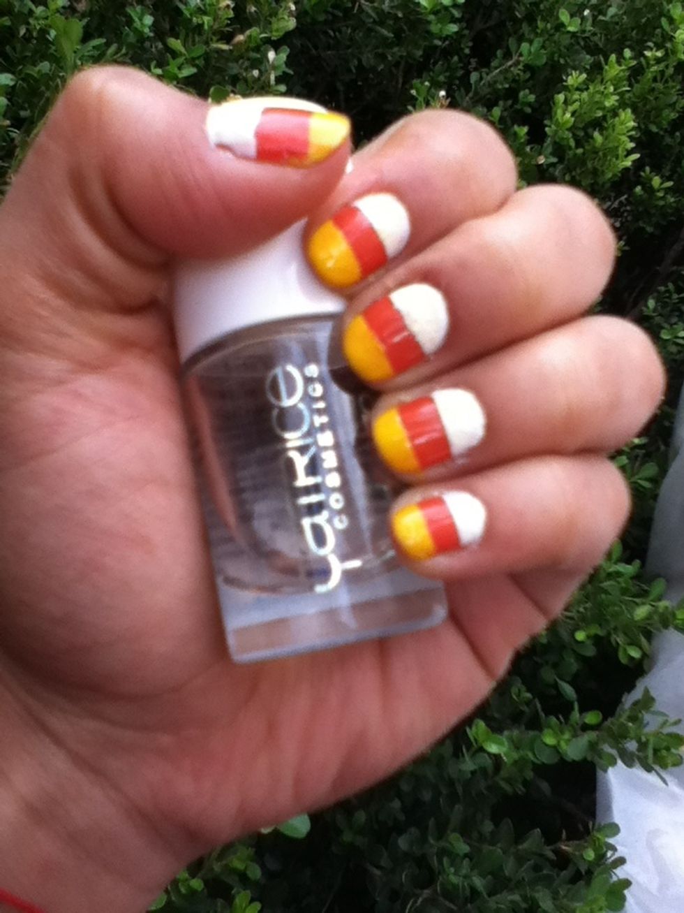 Hi! This is a very easy and quick tutorial!Non complicated and looks really cute! You just going to need: scotch tape,scissors & yellow,orange,white polish & your favourite top coat!Let's go! (=^ω^=)