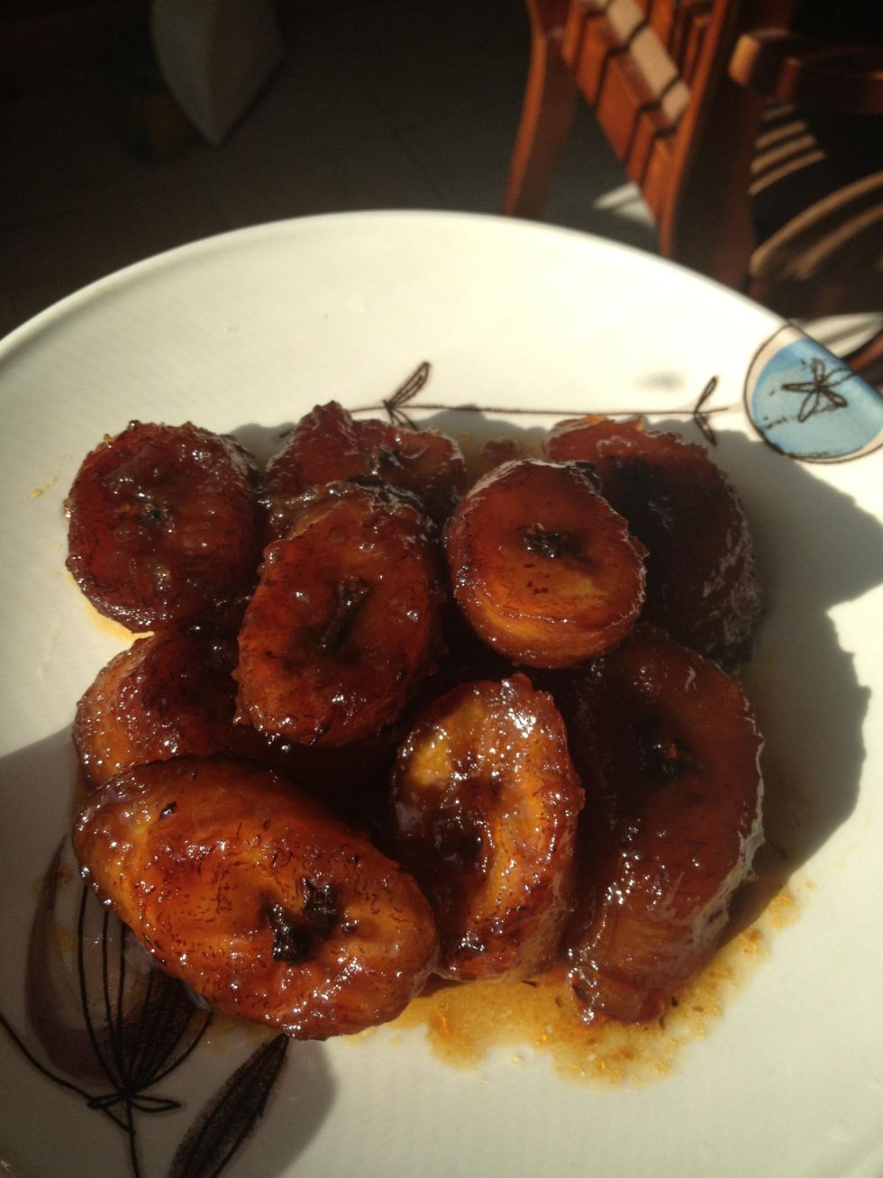 Once the sugar caramelizes, Immediately start adding the plantains and move around in the oil and sugar.