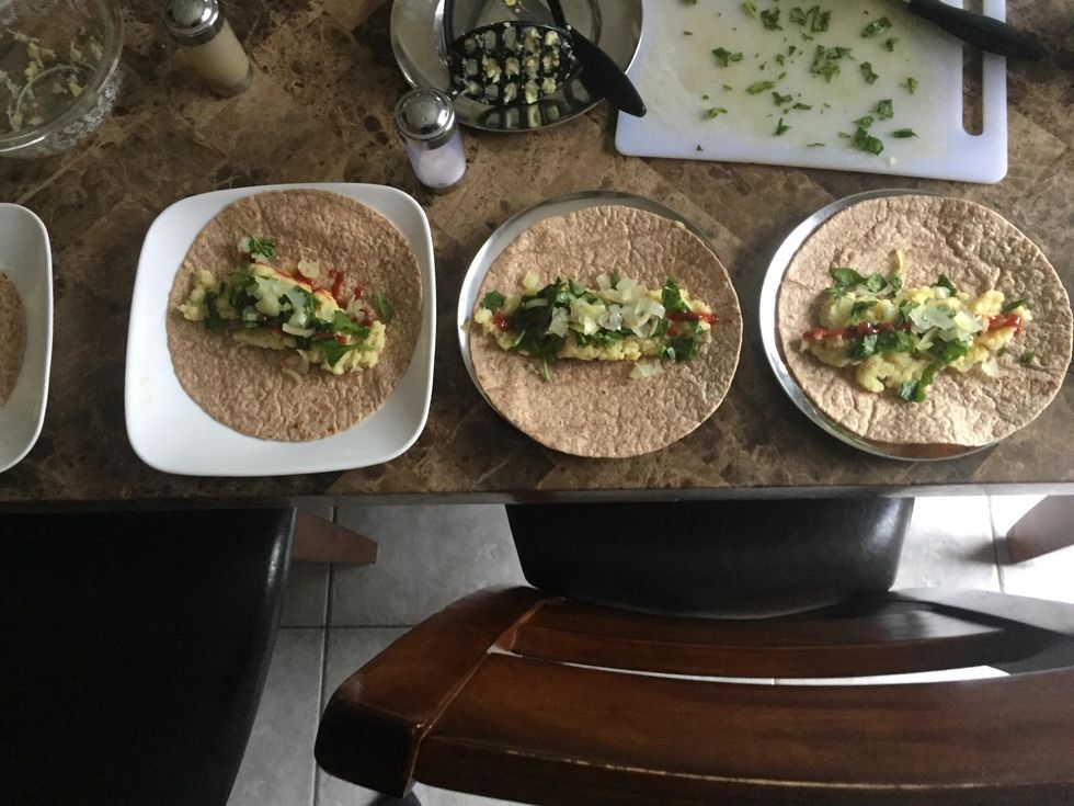 Step 6: Divide potato filling among four tortillas.
