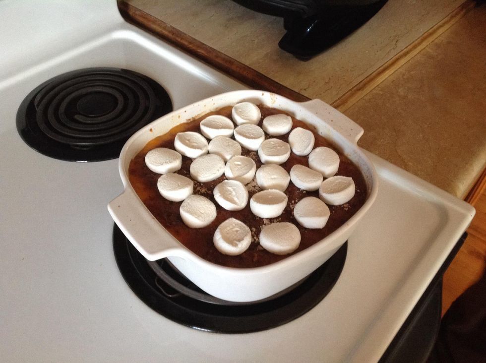 You can also add marshmallows to the top towards the end of the baking process to add in some fluffiness. This time, I sliced large marshmallows into thirds.