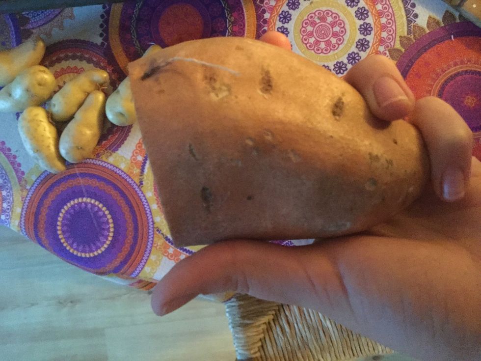 Cut a sweet potato in very small slices. Put the slices on a kitchen paper and sprinkle them with water.