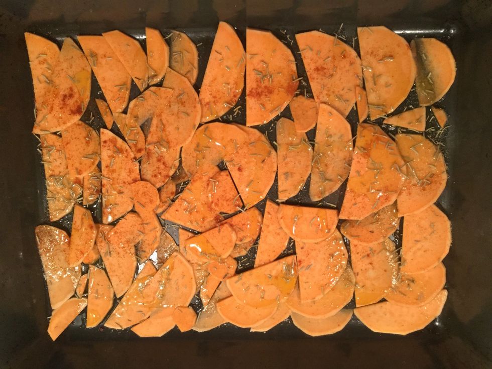 Put the slices on an oven plate and add some herbs. Salt, paprika, garlic powder, rosemary and add oil over the slices.