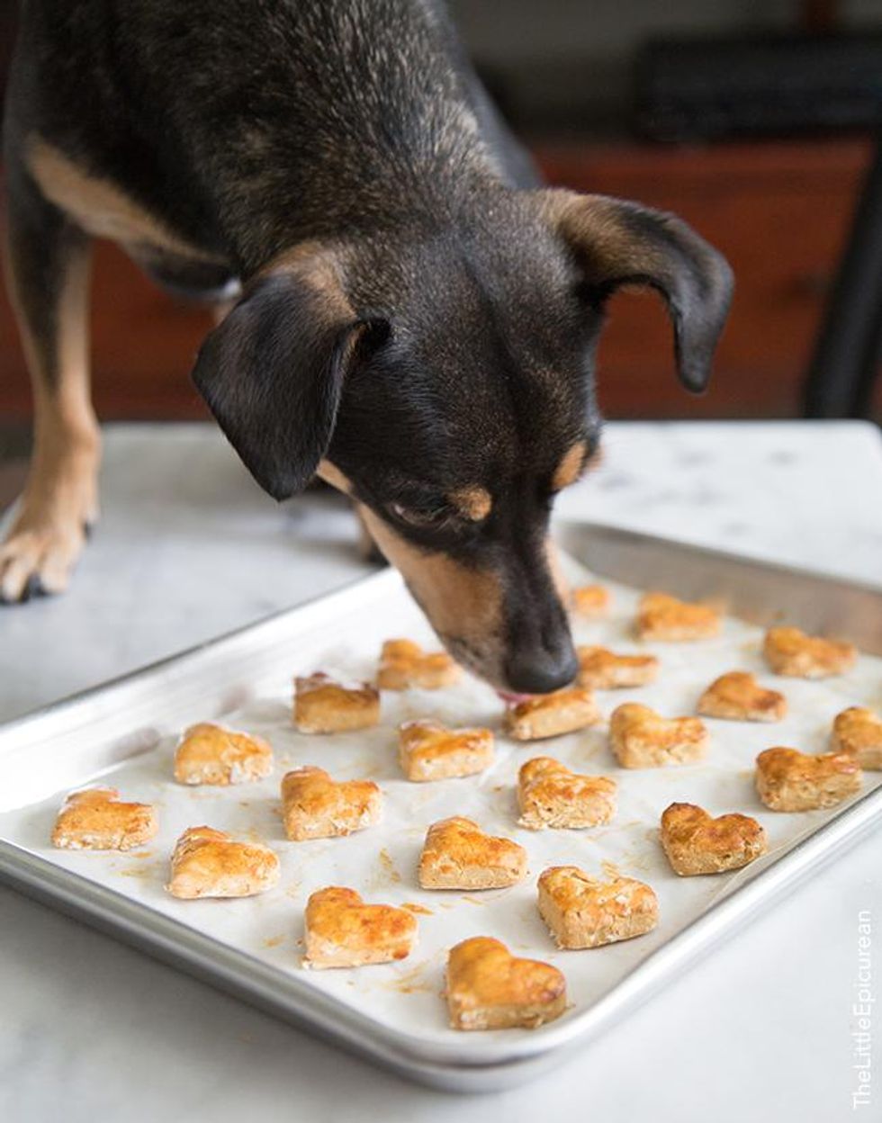 Keep excess baked treats in the freezer. Defrost before feeding. Baked treats last at room temperature for about a week. For more info or more recipes visit: www.thelittleepicurean.com