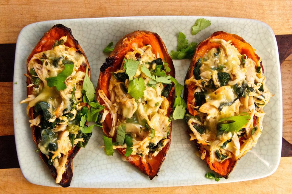 Using your hand, fill each potato half with a generous portion of the chicken mixture, then top each one with the last cup of cheddar. You could use pepper jack instead, or any cheese you prefer.