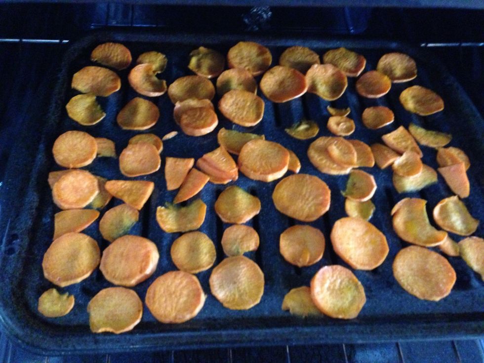 Take out at 15 mins then flip the chips and put seasoned salt on then putting them back into the oven on the bottom rack for 5 more mins